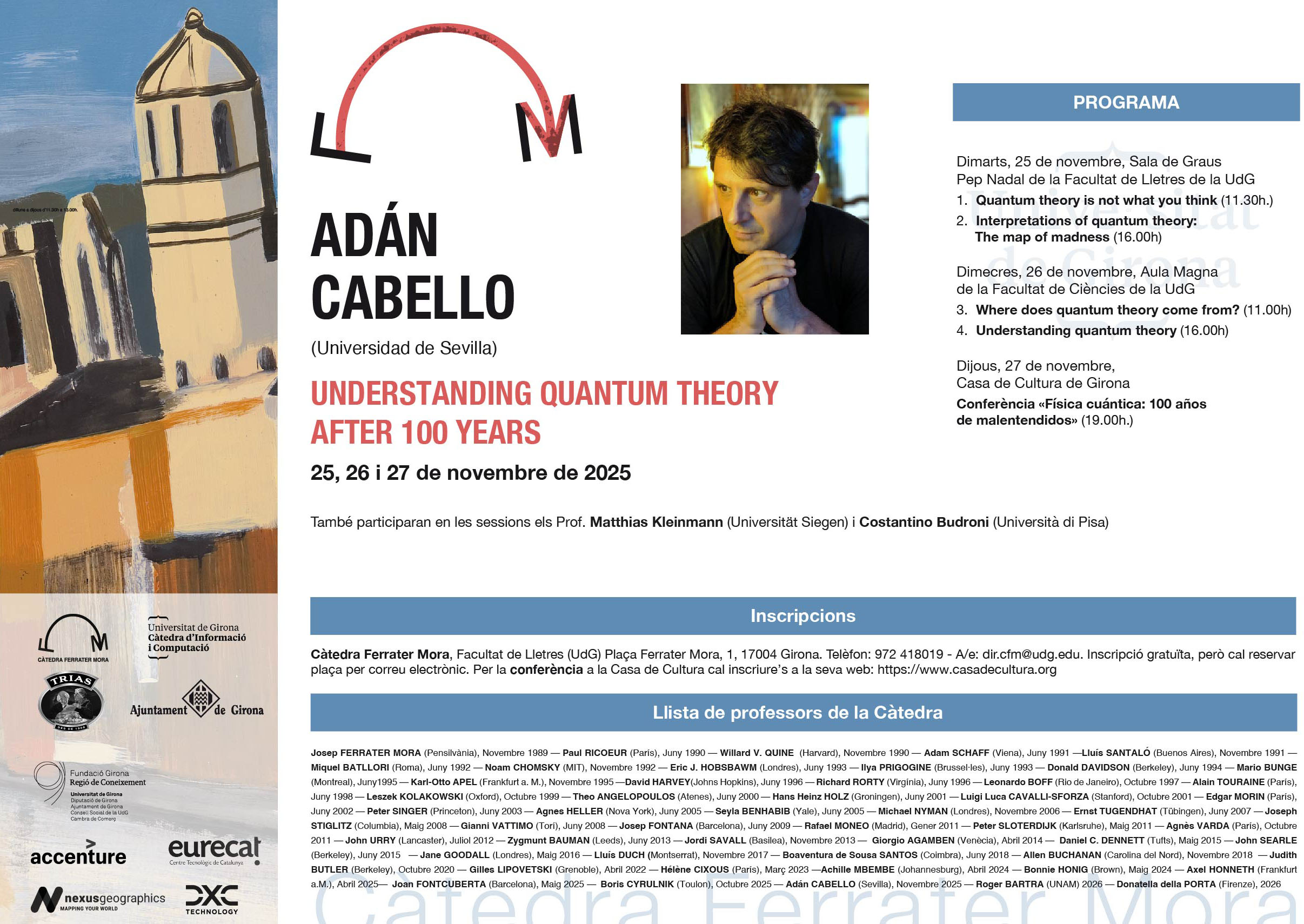 Inscripció gratuïta, però cal reservar plaça per correu electrònic a la Càtedra Ferrater Mora. Per la conferència a la Casa de Cultura cal inscripció a la seva web.